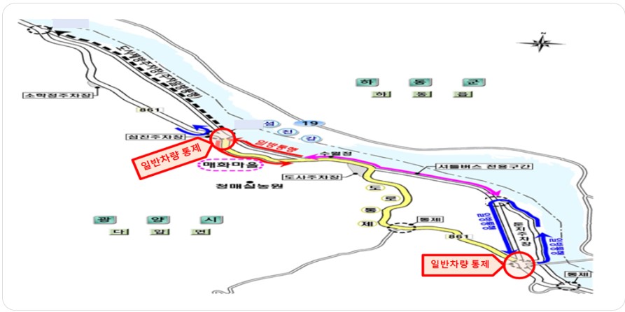 - 둔치 주차장 ~ 매화축제 행사장