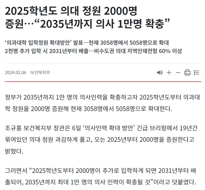 2024년 2월 6일 정부는 의대 정원을 현재 3,058명에서 2,000명 늘리겠다는 정말 파격적인 증원 계획을 밝혔습니다.
